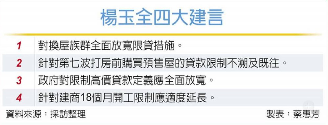 楊玉全四大建議包括:一、針對換屋族群全面放寬限貸措施;二、針對第七波打房前購買預售屋的貸款限制不溯及既往;三、政府對限制高價貸款定義應全面放寬;四、建商18個月開工限制應適度延長。