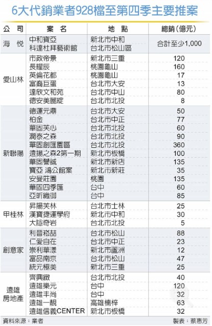據591調查,今年房市歹歹,928檔期全台推案量恐將量縮3千億元,下探至7千億元。至於六大代銷包括海悅國際、愛山林、新聯陽、甲桂林、創意家、遠雄房地產,籌備中新案總銷金額雖較去年保守,但也囊括約3,000億元,主戰場移師北台灣。