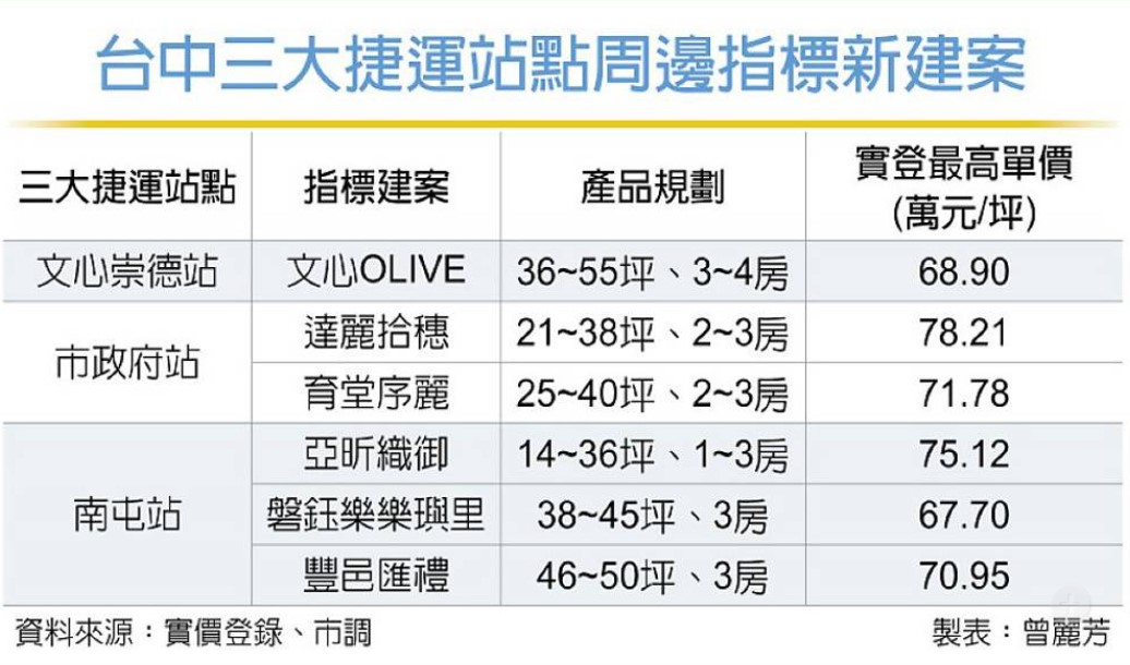 中捷「市政府站」周邊以百貨、商辦大樓為主,住宅產品供給有限,沿線指標新案如達麗「拾穗」最高成交單價達每坪78.21萬元,育堂「序麗」達71.78萬元。
