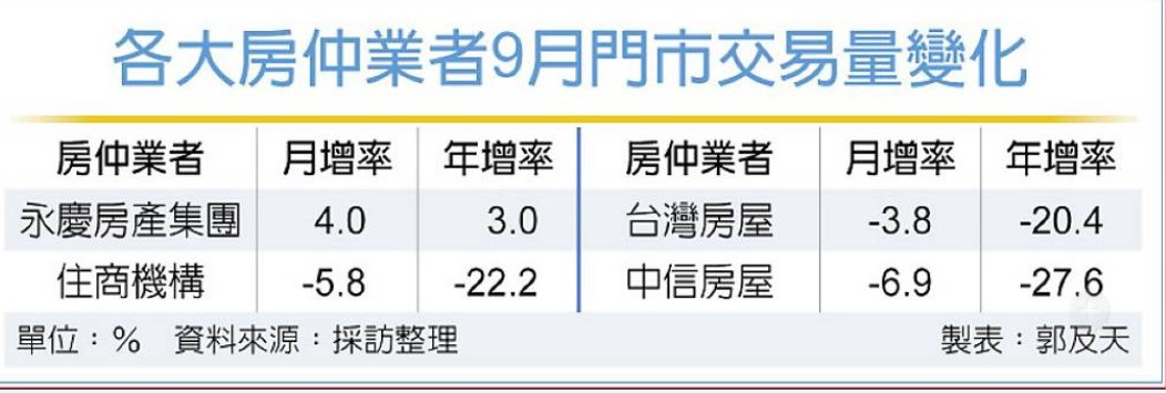 各大房仲業者自結9月門市交易量變化,住商機構、中信房屋、台灣房屋月減幅普遍在3%~7%,年減幅約20%~28%,相較過往普遍在3成甚至4成以上的年減幅,9月業績跌勢見收歛,永慶房產集團9月交易量甚至逆勢年月雙增,月增4%、年增3%。