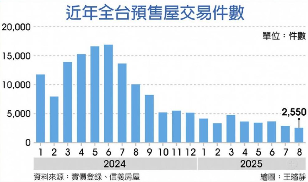 實價登錄統計顯示,去年房市景氣熱絡的5、6月間,預售屋單月交易量可達1.6萬件,隨著去年9月央行推出第七波信用管制後,市場信心轉趨保守,預售屋交易量快速降溫,去年9月跌破1萬件,今年前八個月僅有1月及3月單月超過4,000件,今年平均月均量僅3,565件,是景氣熱絡時期的3成不到,預售市場幾乎全面陷入死寂。