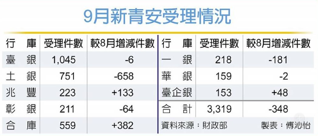 但另一方面,由於其他行庫空出可受理空間,部分先前被轉介的公股銀受理情況也校正回歸,甚至趁此機會休息養生。像是土銀原本受理件數長期逾千件,9月卻罕見僅受理751件,較8月大減658件,一銀和彰銀也各較8月減少了181件和64件,是造成總受理件數下降的主因。