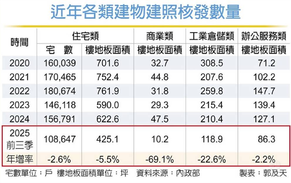 除住宅市場,與整體經濟發展高度相關的商業地產、工業地產,新供給也呈現衰退。包括商店、旅館、遊樂場的商業類來說,過去五年每年建照核發面積普遍在30萬坪以上,今年前三季僅10萬坪,年減幅高達近7成;而辦公室的辦公服務類今年前三季建照核發86萬坪,預估全年也不及過去三年每年逾120萬坪水準。
