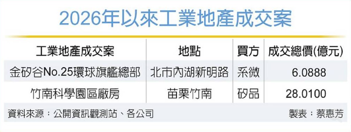 工業地產市場新年續旺,2026開年不到15天,市場連續開出2個紅盤,買主均為科技大廠,包括系微以6.09億元買下內湖「金矽谷No.25環球旗艦總部」預售廠辦一整個樓層,以及矽品砸28.01億元買下聯合再生能源竹南廠,累計成交金額已突破34億元。