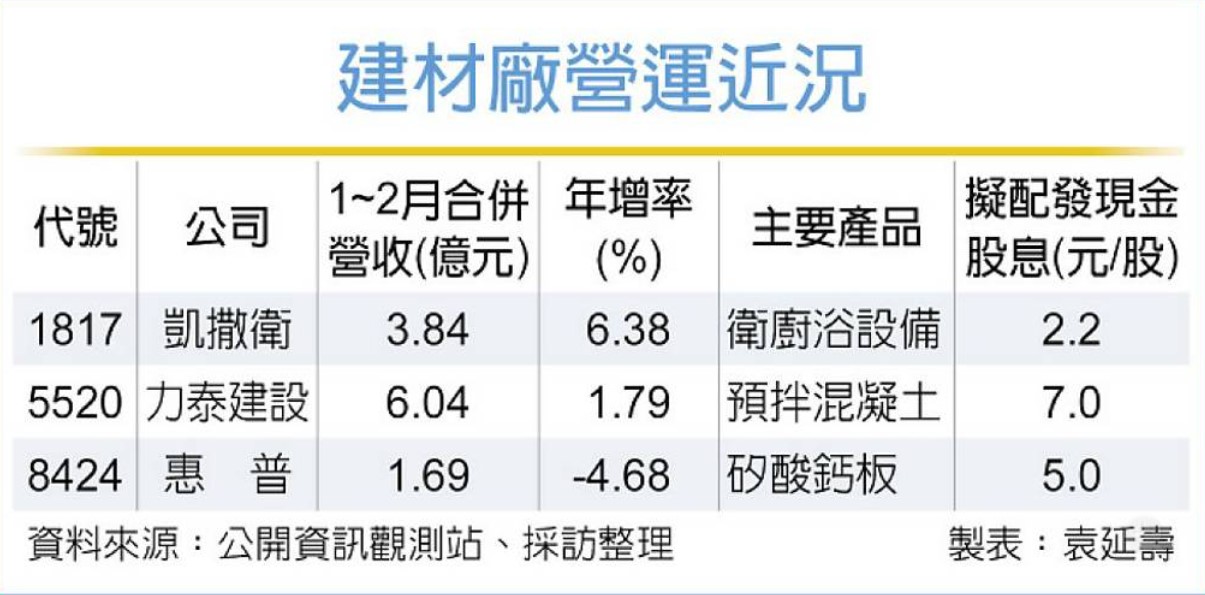 受美伊戰爭影響,景氣波動大,不過凱撒衛(1817)、力泰(5520)、惠普(8424)等建材廠,今年股利發放大方,現金殖利率都在5.5%以上,加上新建工程訂單量增,營運成長能見度高,市場看好能成為市場「抗跌保值」標的。