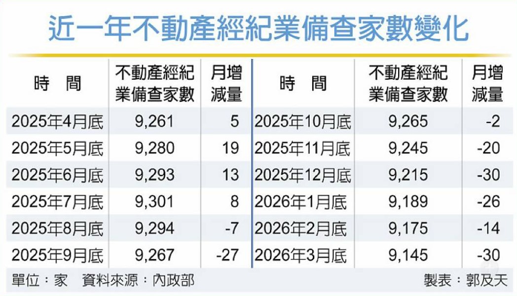 統計顯示,不動產經紀業家數於去年7月攀升至9,301家的歷史新高後,因房市交易量持續萎縮,短短八個月內減少156家。